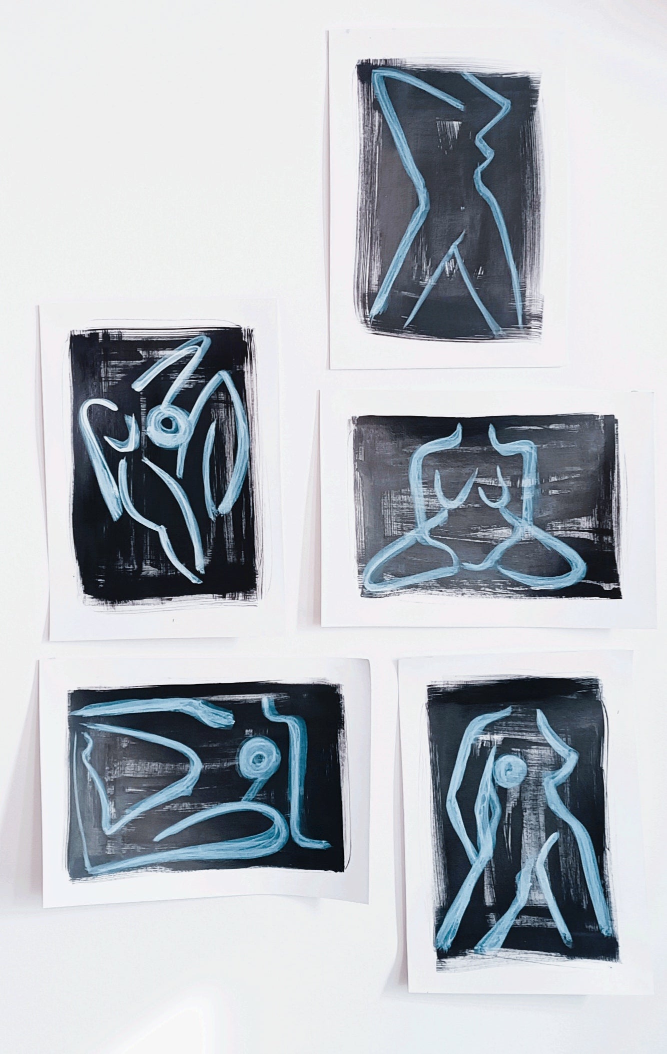 The Black Ink Paintings are bold, raw, and unapologetic — abstract artworks forged from fire and energy. Made with deep black Indian Ink washes and visible, gestural brushstrokes, they embody the intensity of coal, graffiti, and expression. Figures are caught between movement and stillness, echoing both fragility and strength.