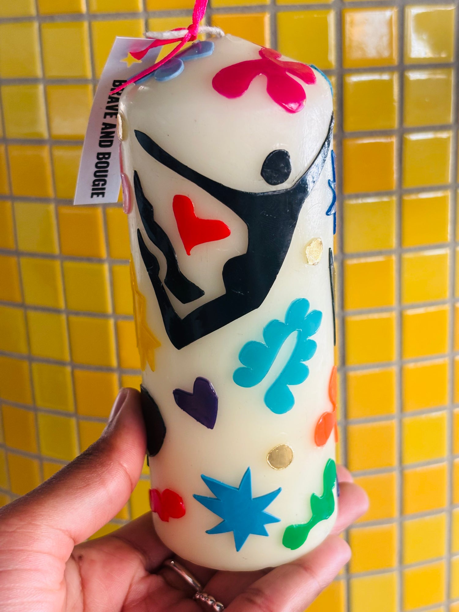 Bring colour, creativity, and meaning into your life with hand-decorated BRAVE AND BOUGIE candles, designed and made entirely from wax and wax mediums to ensure they are completely burn-friendly.