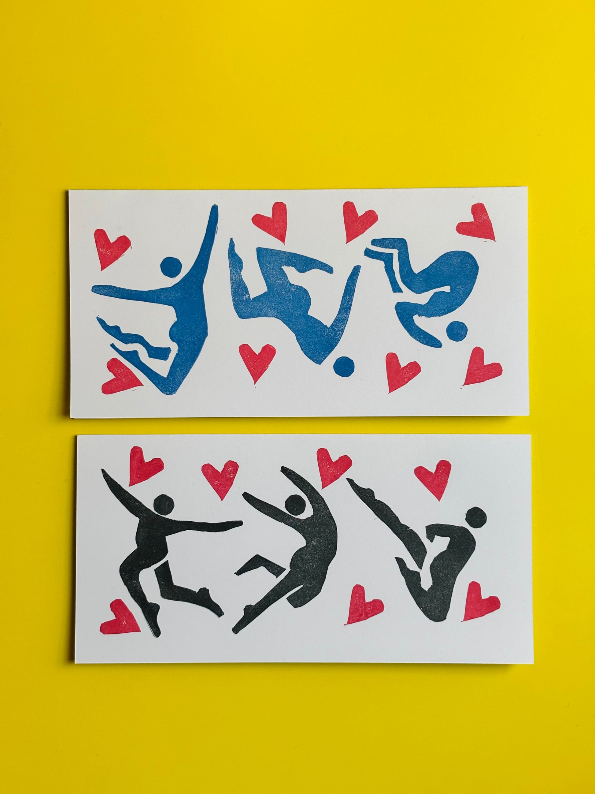 Hearts & Motion Linocut Card Pair – Diving & Tumbling Figures