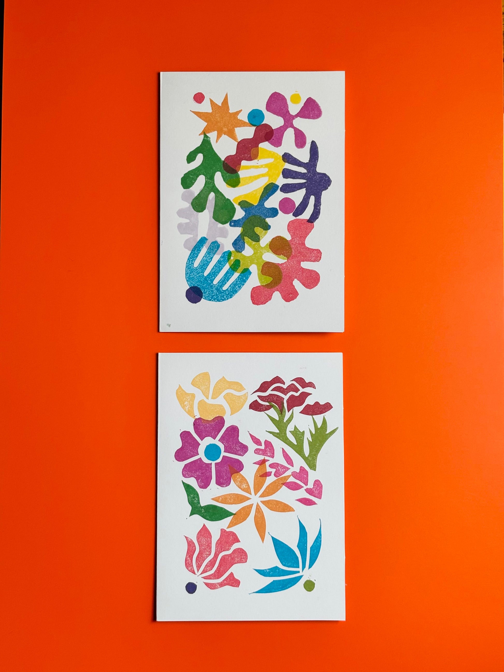 A joyful set of two A6 linocut greeting cards, hand-stamped with bold, expressive designs. Perfect for birthdays, thank-yous, or heartfelt notes, this duo gives you two unique artworks to send or save. Each card comes with a matching envelope for easy gifting.