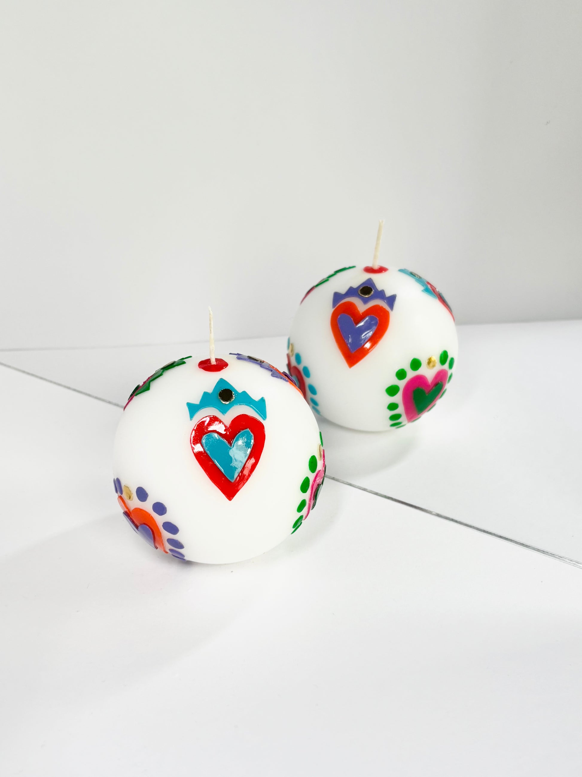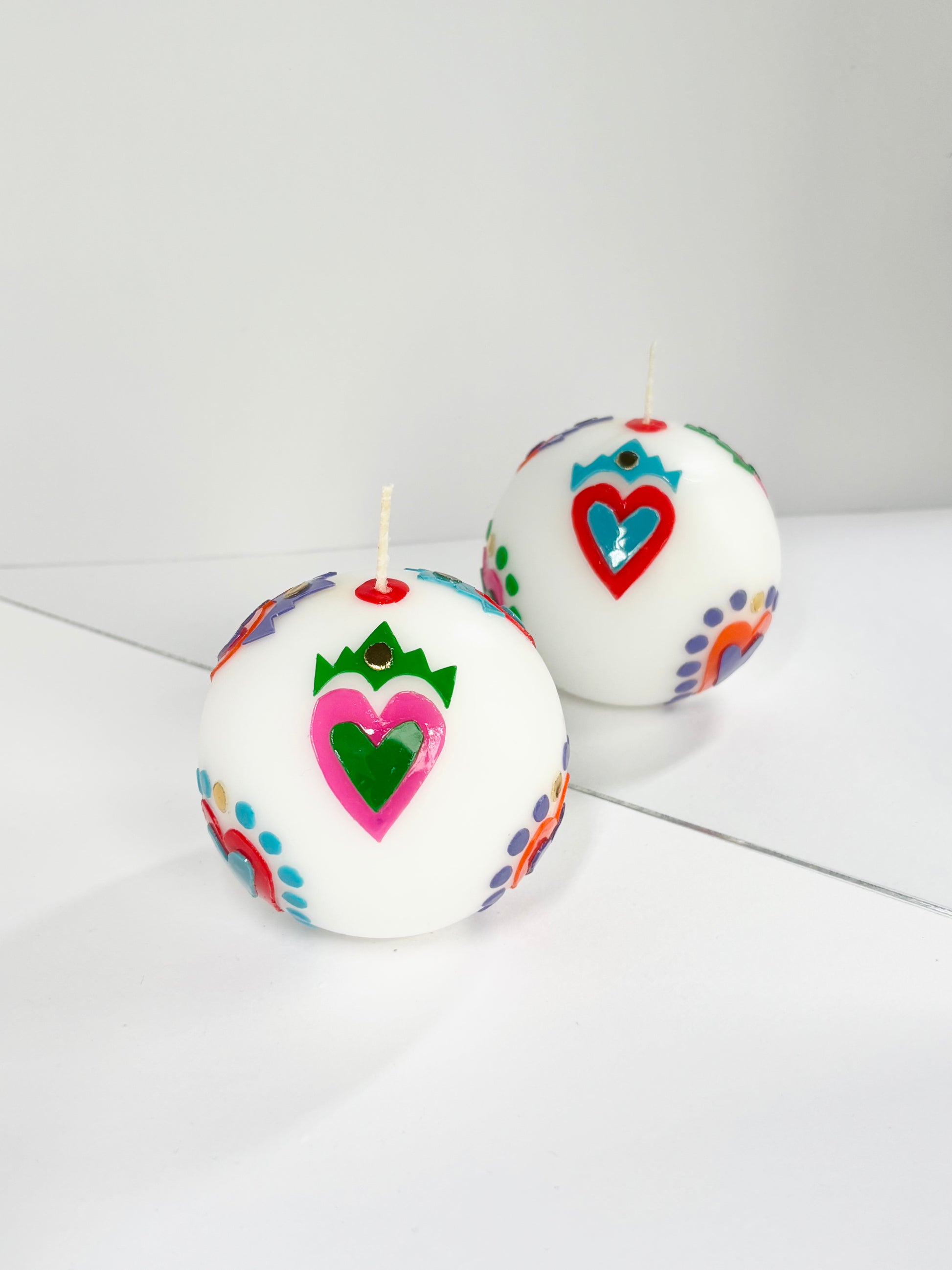 Celebrate love with our Sacred Hearts Ball Candle in Rainbow. Adorned with multicoloured hearts and crowns, this hand-decorated soy wax candle adds a joyful touch to any space, making it a perfect gift for celebratory events and colourful home decor.