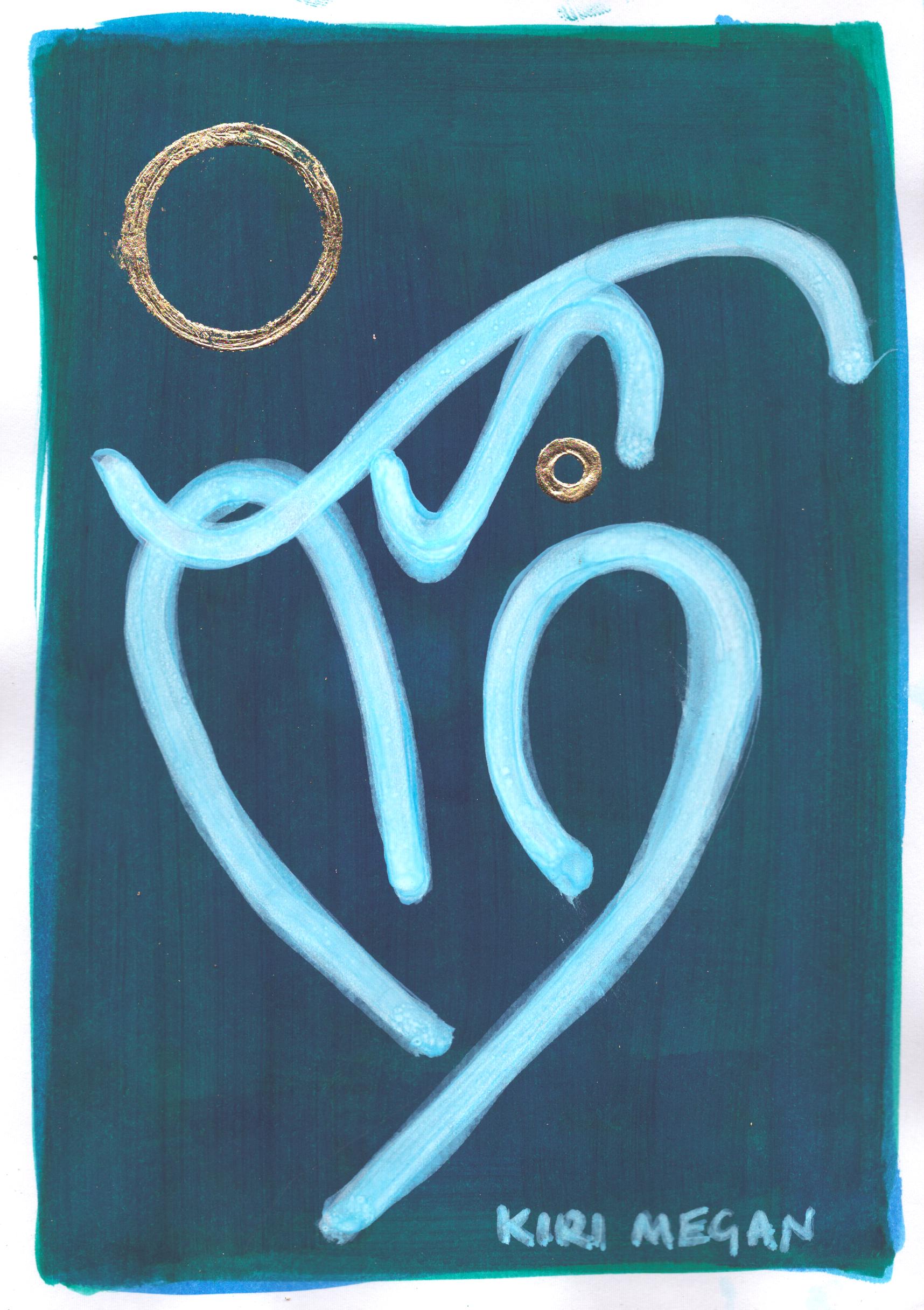 Created on deep blue-wash backgrounds, each work is alive with abstracted figurative motifs, looping gold leaf hoops, and crisp posca pen details.