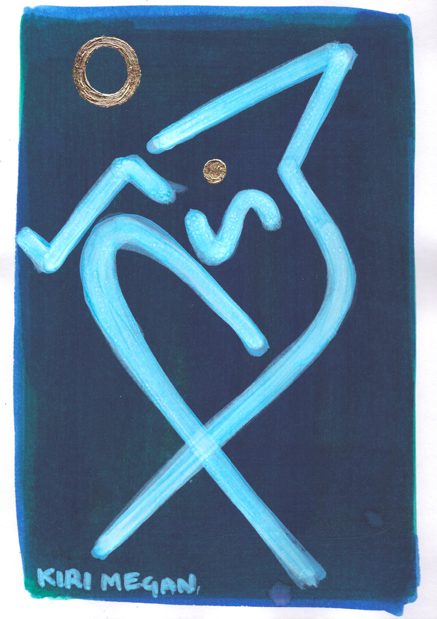 Created on deep blue-wash backgrounds, each work is alive with abstracted figurative motifs, looping gold leaf hoops, and crisp posca pen details.