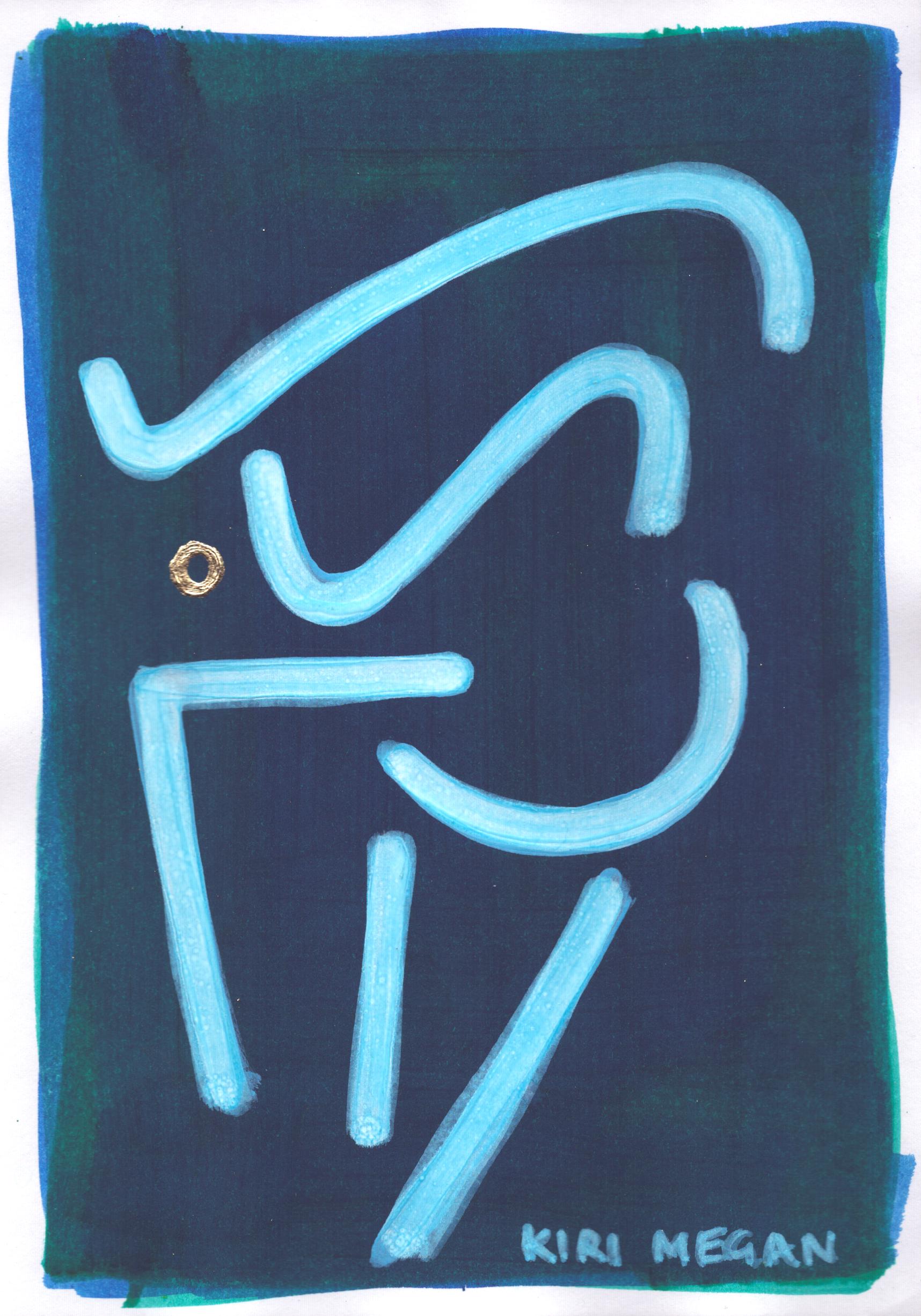 Created on deep blue-wash backgrounds, each work is alive with abstracted figurative motifs, looping gold leaf hoops, and crisp posca pen details.